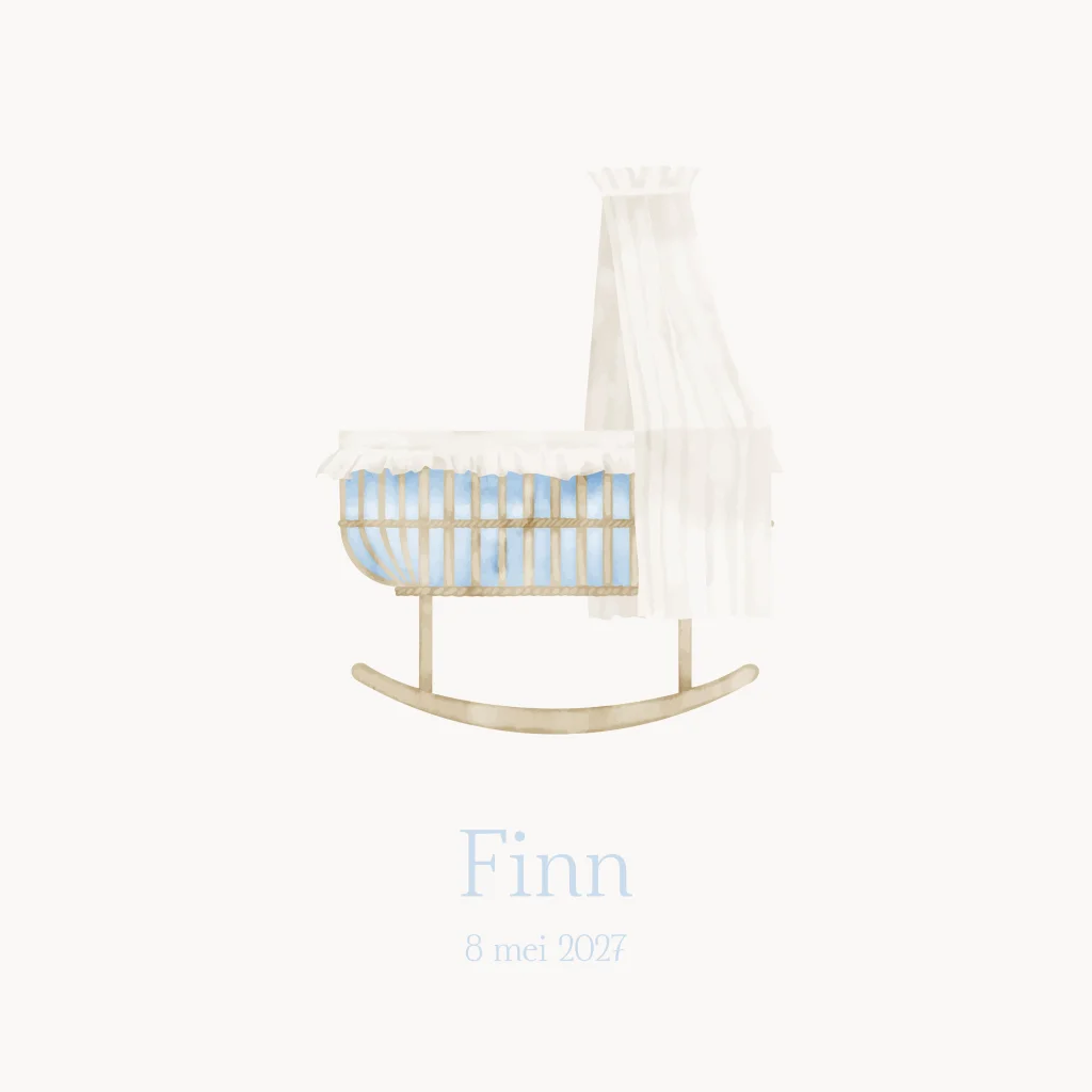 Geboortekaartje met een illustratie van een blauw wiegje.