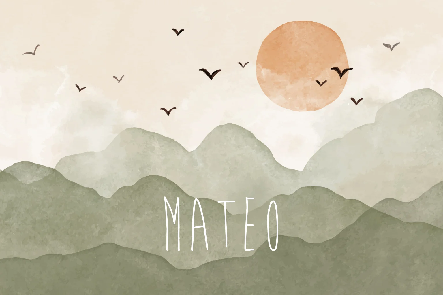 Stoer geboortekaartje met bergen en zon, perfect voor een jongen. De zachte groene tinten en illustratie van vogels geven dit kaartje een rustige, natuurlijke uitstraling. Personaliseer naam, datum en kleuren eenvoudig in de editor en maak er een uniek kaartje van voor jullie kleintje.