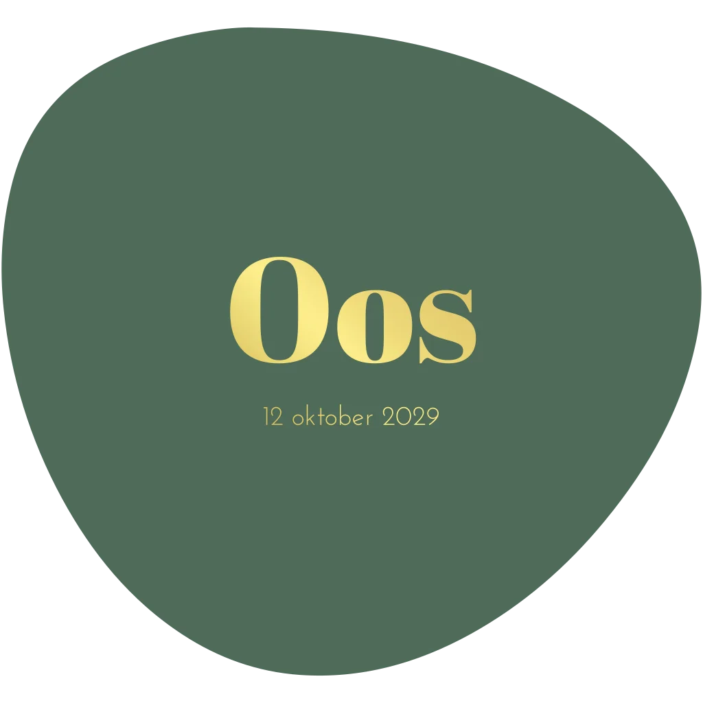 Stoer geboortekaartje in pebble vorm met donkergroene achtergrond en goudkleurige naam. Dit moderne ontwerp heeft een stijlvolle uitstraling en is ideaal voor wie houdt van een strak en eigentijds kaartje. Personaliseer eenvoudig naam, kleur en lettertype in de editor en maak het helemaal eigen.