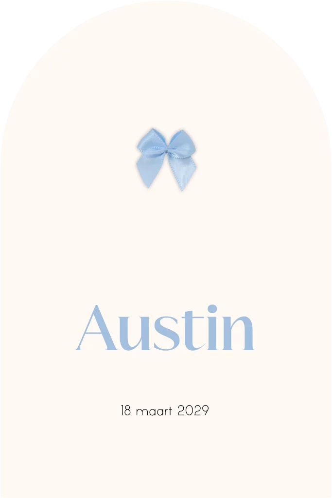 Lief geboortekaartje met een subtiele blauwe strik en moderne boogvorm. De rustige kleuren en minimalistische stijl zorgen voor een tijdloze uitstraling. Perfect voor ouders die houden van eenvoud met een vleugje elegantie. Pas het ontwerp zelf aan in de editor en maak er een persoonlijk kaartje van dat helemaal bij jullie past.