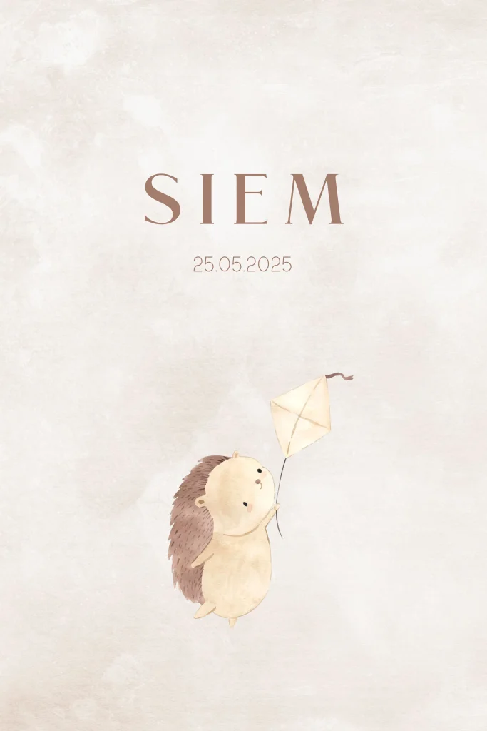 Geboortekaartje met een illustratie van een egeltje dat een vlieger vasthoudt. De achtergrond heeft een zachte beige structuur, waardoor het ontwerp een warme en natuurlijke uitstraling krijgt. Pas dit kaartje gemakkelijk aan in de editor.