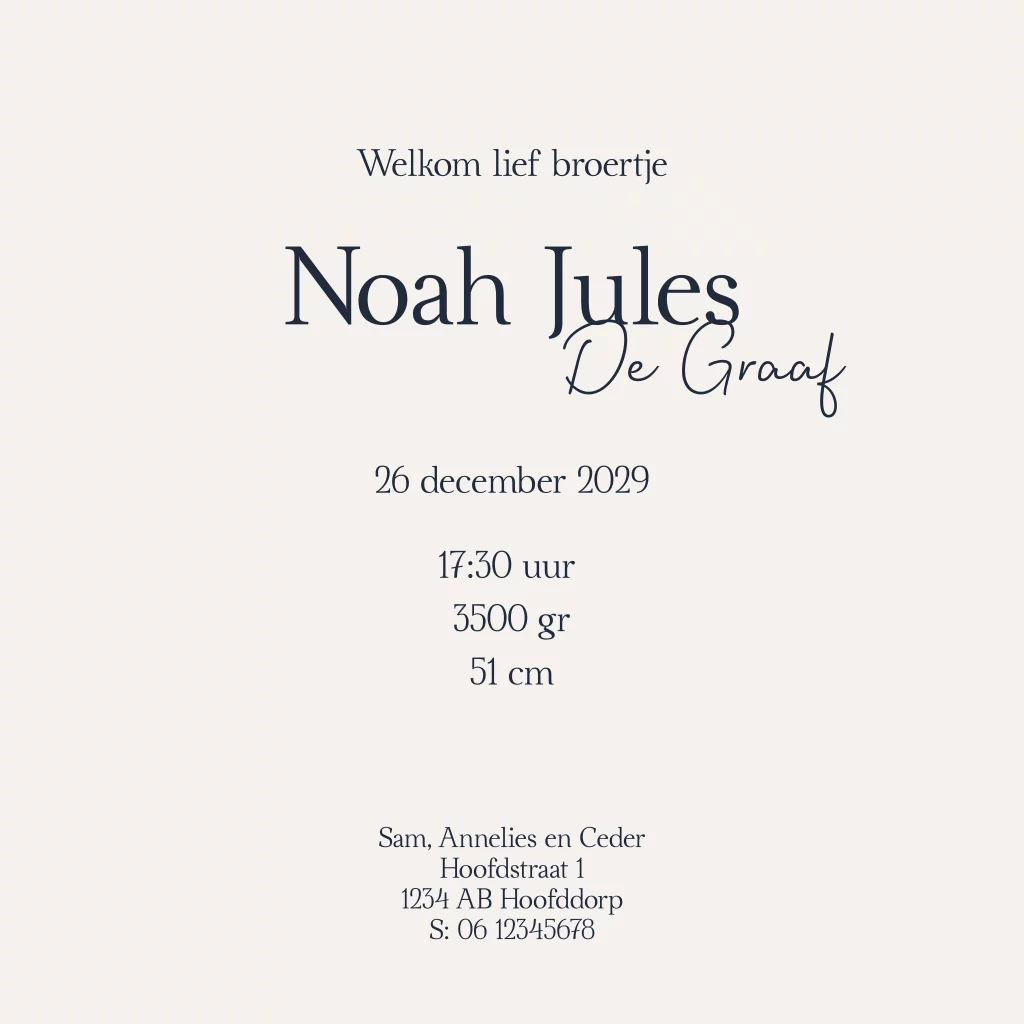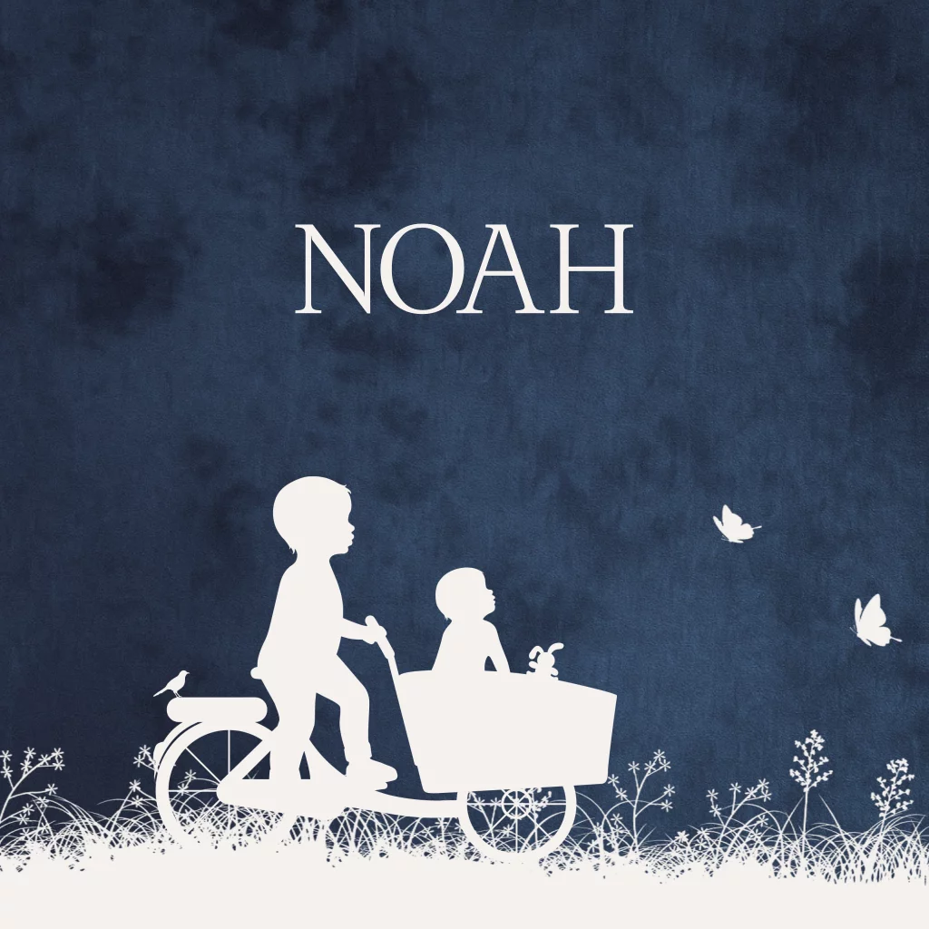 Een stijlvol geboortekaartje met een wit silhouet van kinderen op de fiets, afgebeeld tegen een diepe nachtblauwe achtergrond. Het contrast zorgt voor een moderne en tijdloze uitstraling.