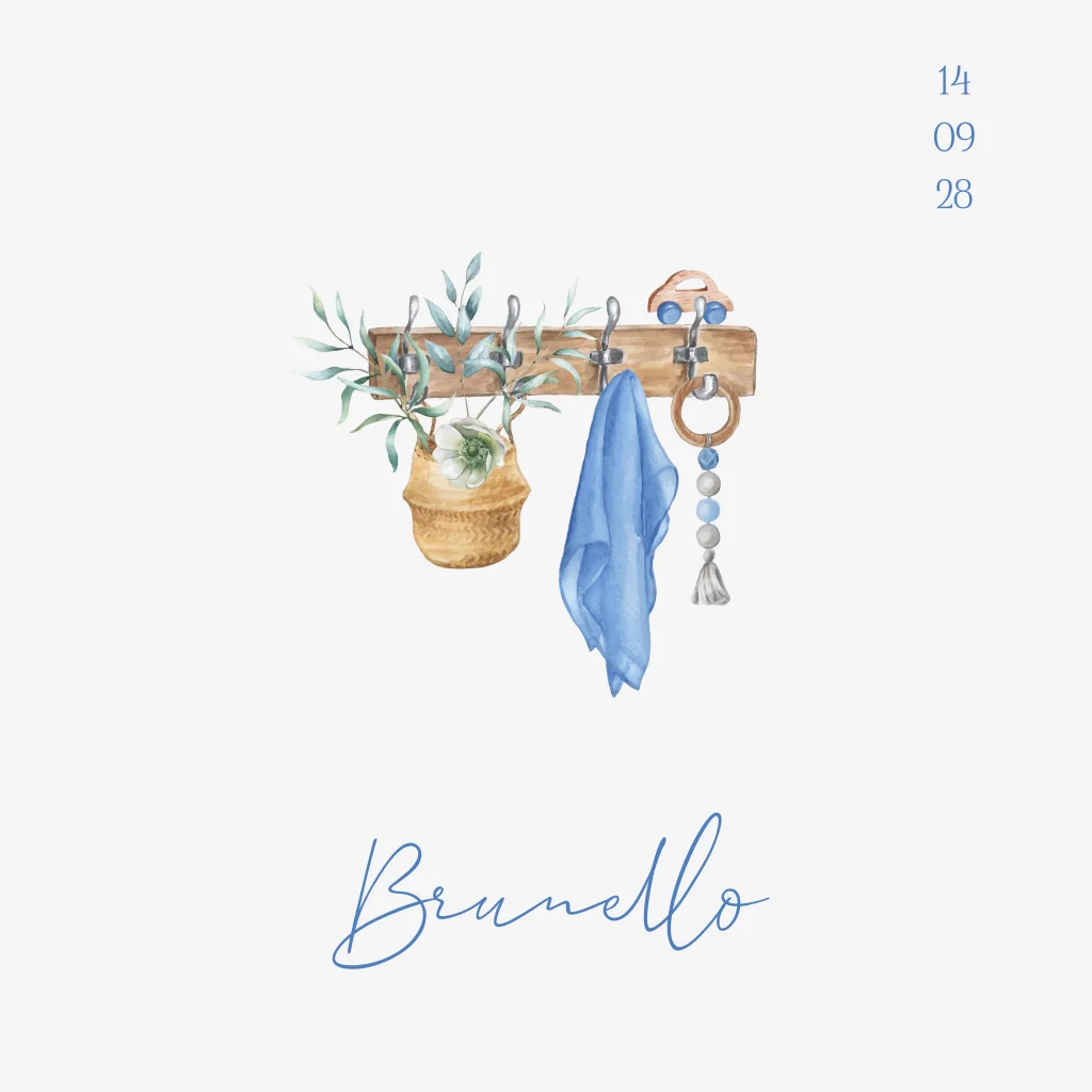Een zacht en sfeervol geboortekaartje met aquarelillustratie van een houten kapstokje met blauwtinten. Het ontwerp combineert natuurlijke materialen met subtiele details voor een warme, huiselijke uitstraling.