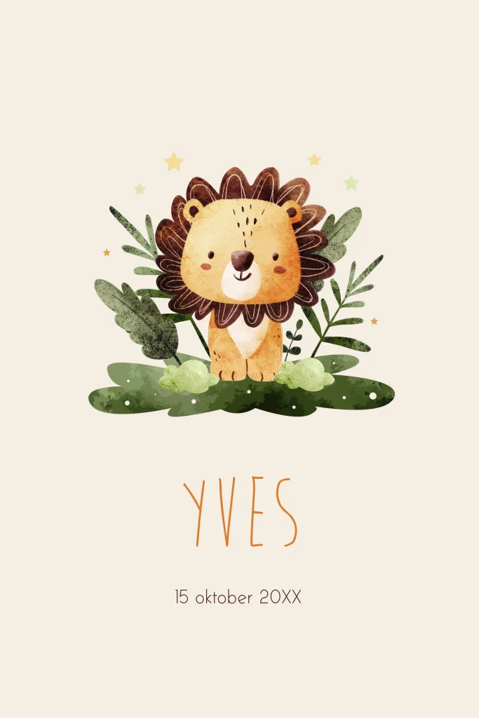 Lief geboortekaartje met leeuwtje in zachte aardetinten. Het vrolijke ontwerp met jungleblad en sterretjes maakt dit kaartje ideaal voor een jongetje. De illustratie geeft een warme, speelse uitstraling. Pas eenvoudig de naam, datum en kleuren aan in de online editor en maak het helemaal eigen.
