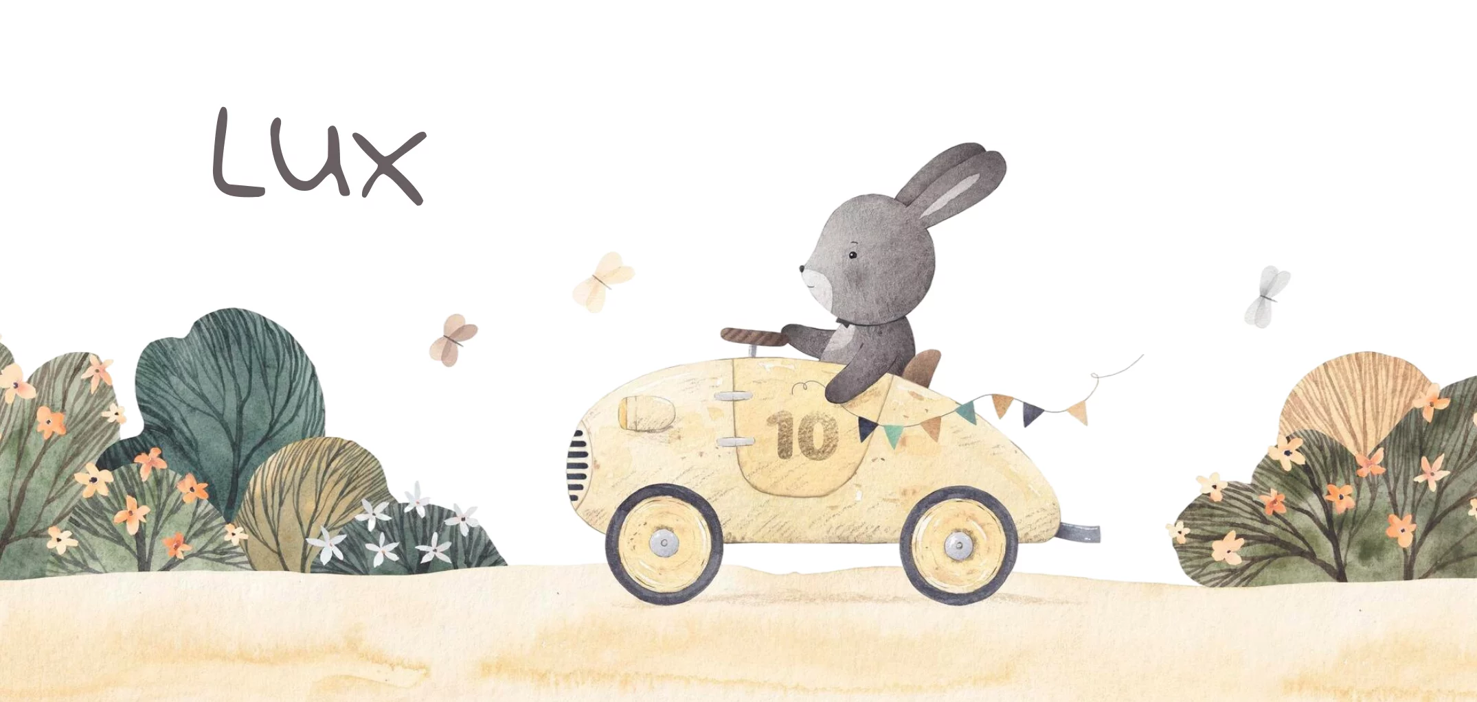 Lief geboortekaartje met een konijntje in een raceautootje, omringd door bloemen en zachte natuurtinten. Het langwerpige ontwerp maakt dit kaartje speels en modern tegelijk. Voeg eenvoudig naam, datum en lettertype toe in de editor en ontwerp een kaartje dat perfect past bij jullie kindje.