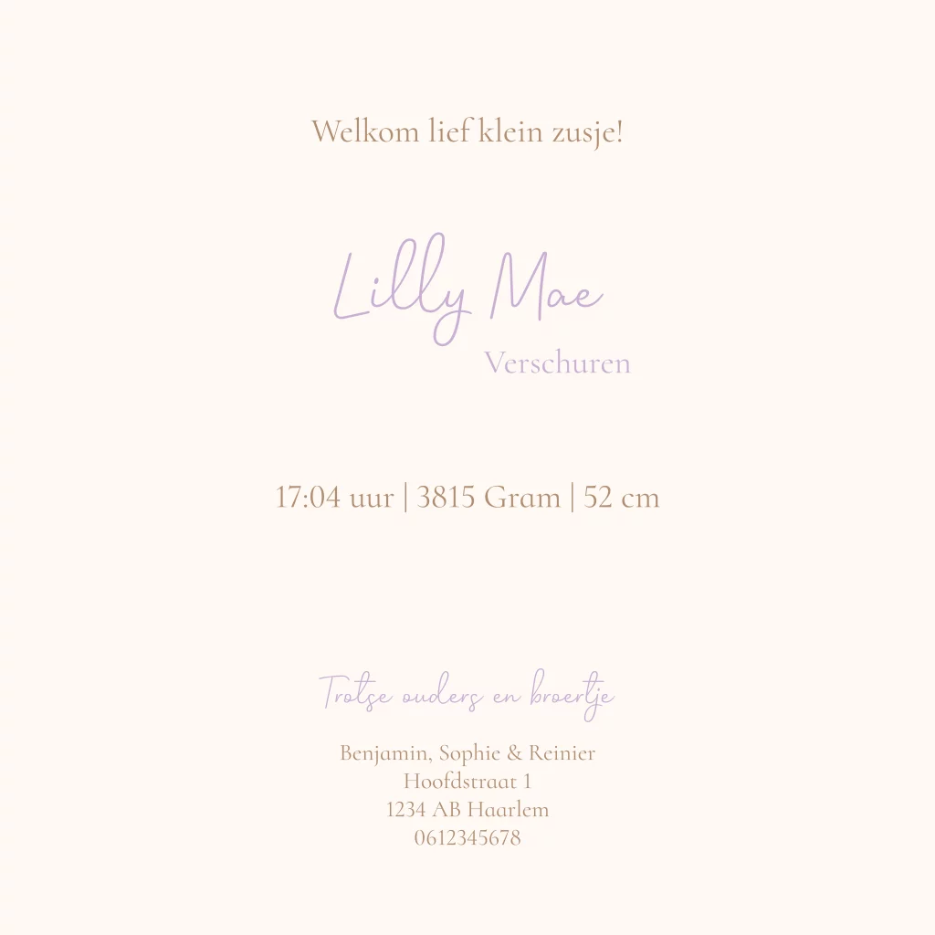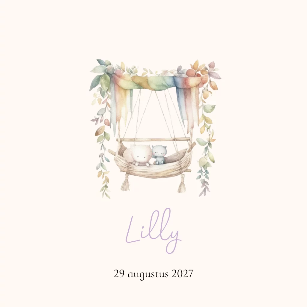 Lief geboortekaartje met een dromerig wiegje omringd door sierlijke bloemen.
