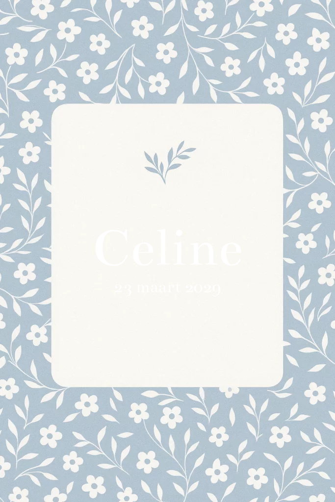 Een klassiek geboortekaartje met een blauw bloemenpatroon en subtiele gouden accenten. De zachte kleuren en het elegante ontwerp zorgen voor een tijdloze uitstraling.