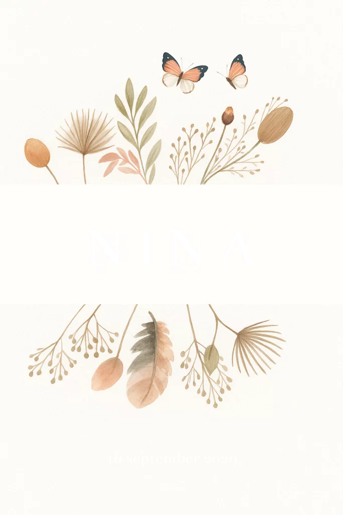 Een zacht geboortekaartje met natuurlijke elementen zoals bloemen, takjes en vlinders in warme aardetinten. Het ontwerp heeft een serene uitstraling met subtiele gouden letters voor een luxe accent.
