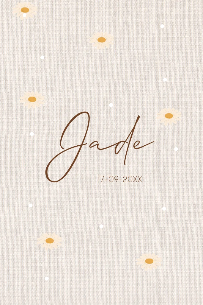 Minimalistisch geboortekaartje met bloemetjes en linnenlook achtergrond. De subtiele gele details geven dit ontwerp een zachte en natuurlijke uitstraling. Perfect voor wie houdt van een rustig, modern kaartje met een vleugje speelsheid. Pas eenvoudig de naam, kleuren en lettertypes aan in de online editor en maak er jullie eigen ontwerp van.