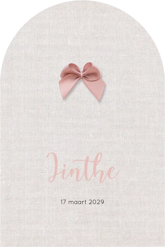 Lief geboortekaartje met roze strik en linnenlook achtergrond. De zachte tinten en ronde boogvorm geven dit ontwerp een elegante en tijdloze uitstraling. Perfect voor een stijlvol welkom van jullie dochter. Pas naam, lettertype en kleuren eenvoudig aan in de editor en maak er jullie eigen unieke kaart van.