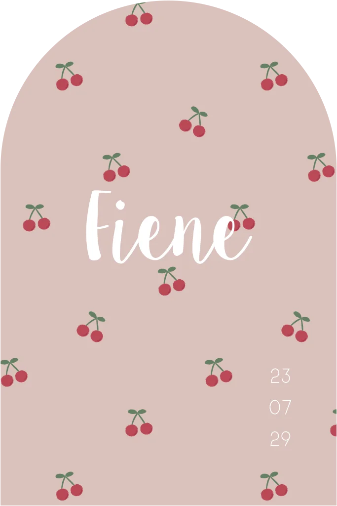 Geboortekaartje in boogvorm met een patroon van rode kersjes op een zachte roze achtergrond. De witte sierletters zorgen voor een frisse en moderne uitstraling. Het ontwerp is volledig aanpasbaar in de online editor. Voeg eenvoudig de naam, datum en kleuren toe naar wens.
