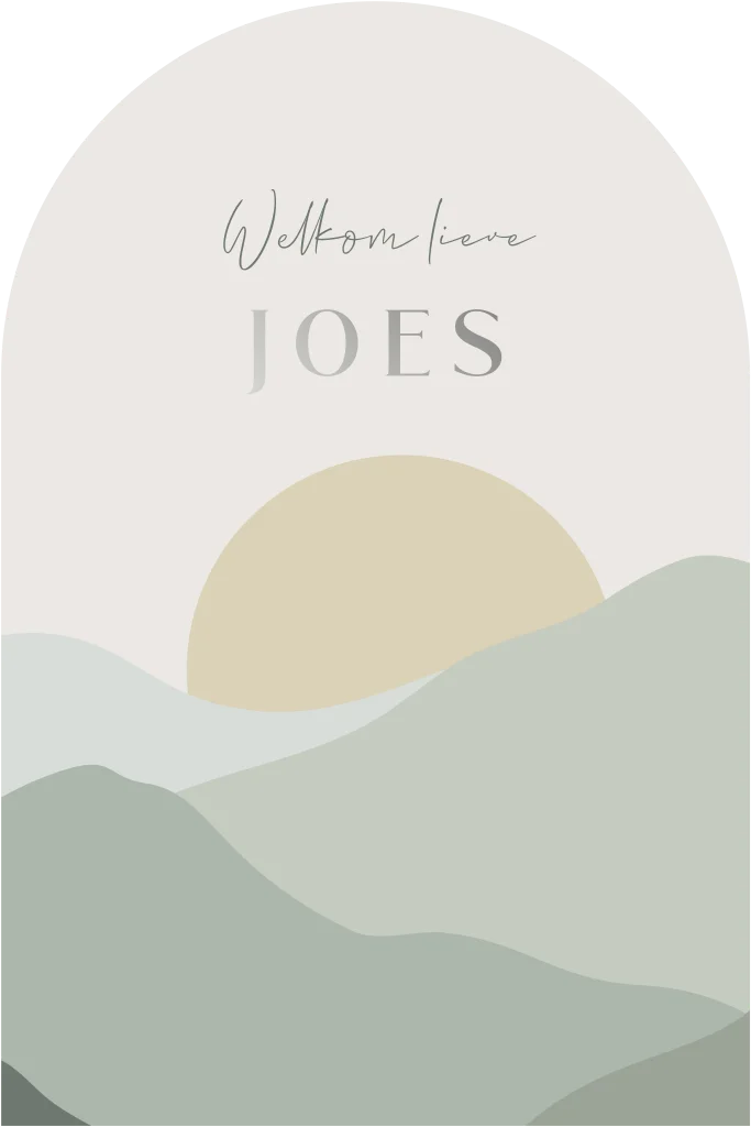 Modern geboortekaartje met zachte bergvormen en een zon in minimalistische stijl. De rustige aardetinten geven dit ontwerp een natuurlijke, serene uitstraling. Perfect voor ouders die houden van eenvoud en warmte. Pas naam, tekst en kleuren eenvoudig aan in de editor en maak het kaartje persoonlijk.