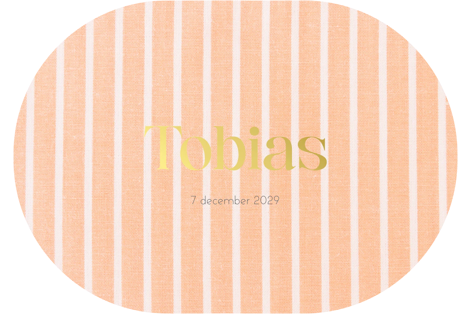 Modern geboortekaartje met strepen in zachte perzikkleur. De ovale vorm geeft het ontwerp een eigentijdse uitstraling, perfect voor ouders die van stijlvol en subtiel houden. Pas de naam en kleuren eenvoudig aan in de online editor voor een uniek kaartje dat helemaal bij jullie past.