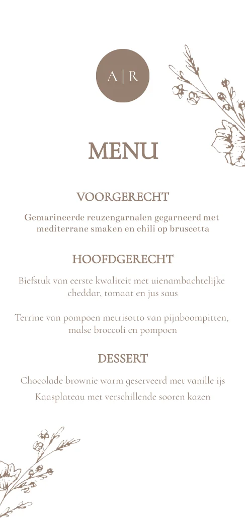 Elegante menukaart met een minimalistisch ontwerp en zachte bloemaccenten.