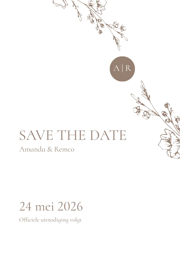 Elegante Save the Date kaart met een minimalistisch ontwerp, zachte bloemaccenten en een moderne uitstraling