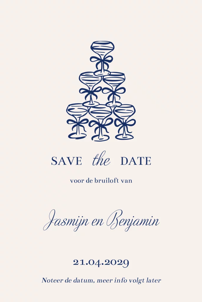 Een stijlvol Save the Date kaartje met een moderne illustratie van champagneglazen in diepblauw. Het ontwerp combineert elegantie met een feestelijke uitstraling perfect om jullie trouwdatum aan te kondigen.