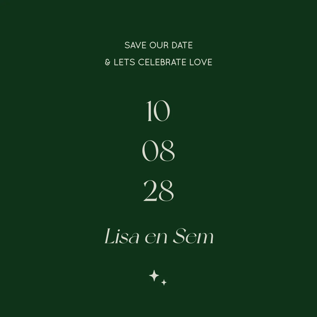 Een stijlvol Save the Date kaartje met een diepe groene achtergrond en moderne typografie. De verticale datum zorgt voor een strak en elegant geheel.