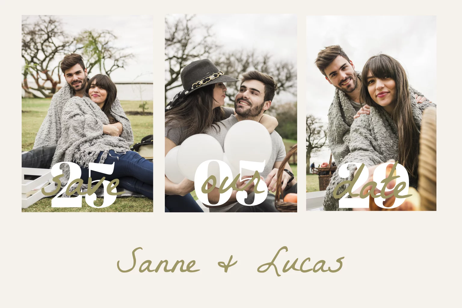 Een speels Save the Date kaartje met ruimte voor drie persoonlijke foto’s. De natuurlijke tinten en handgeschreven letters zorgen voor een warme, uitnodigende uitstraling. Upload eenvoudig je eigen foto’s en pas namen, datum en tekst aan in de editor.