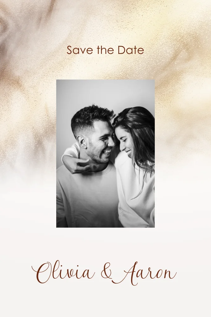 Romantische Save the Date kaart met foto en een zachte goudlook achtergrond. De combinatie van beige tinten en sierlijk lettertype geeft de kaart een stijlvolle en moderne uitstraling. Voeg jullie favoriete foto toe, pas de namen en datum aan en maak er een persoonlijke aankondiging van voor jullie grote dag.