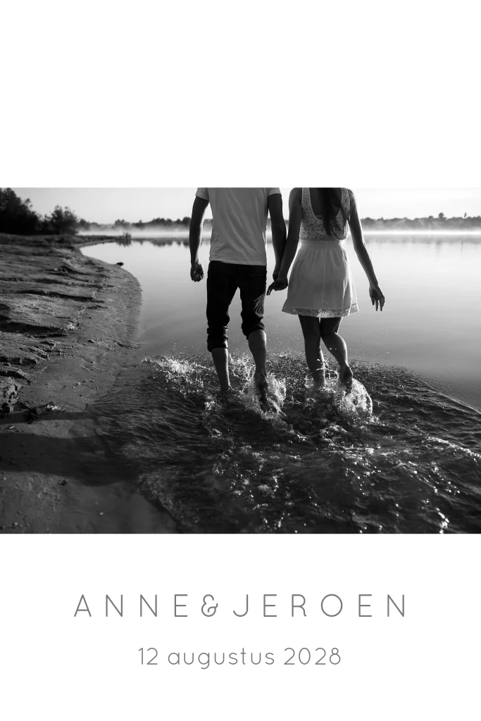 Een modern Save the Date kaartje met ruimte voor een eigen foto. De combinatie van zwart-wit en goudkleurige accenten zorgt voor een stijlvolle, tijdloze uitstraling. Upload eenvoudig je eigen foto en pas namen, datum en tekst aan in de editor.