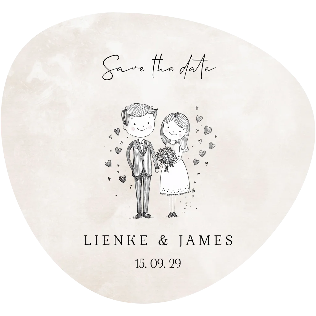 Lieve Save the Date kaart in pebble-vorm met handgetekende illustratie van bruid en bruidegom. De zachte tinten en speelse vorm zorgen voor een romantische en vrolijke uitstraling. Ideaal om jullie trouwdatum op een persoonlijke manier aan te kondigen.
