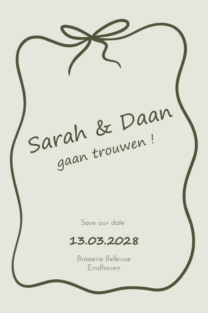 Een speels Save the Date kaartje met een golvende kaderlijn en strikdetail. De groene tint en handgeschreven typografie geven het ontwerp een frisse en moderne uitstraling.