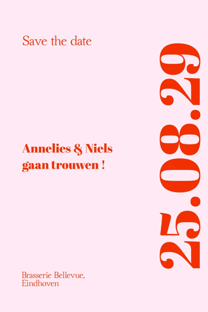 en opvallend Save the Date kaartje met eigentijdse typografie en een contrasterend kleurenpalet van roze en oranje. De verticale datum zorgt voor een moderne en grafische uitstraling.