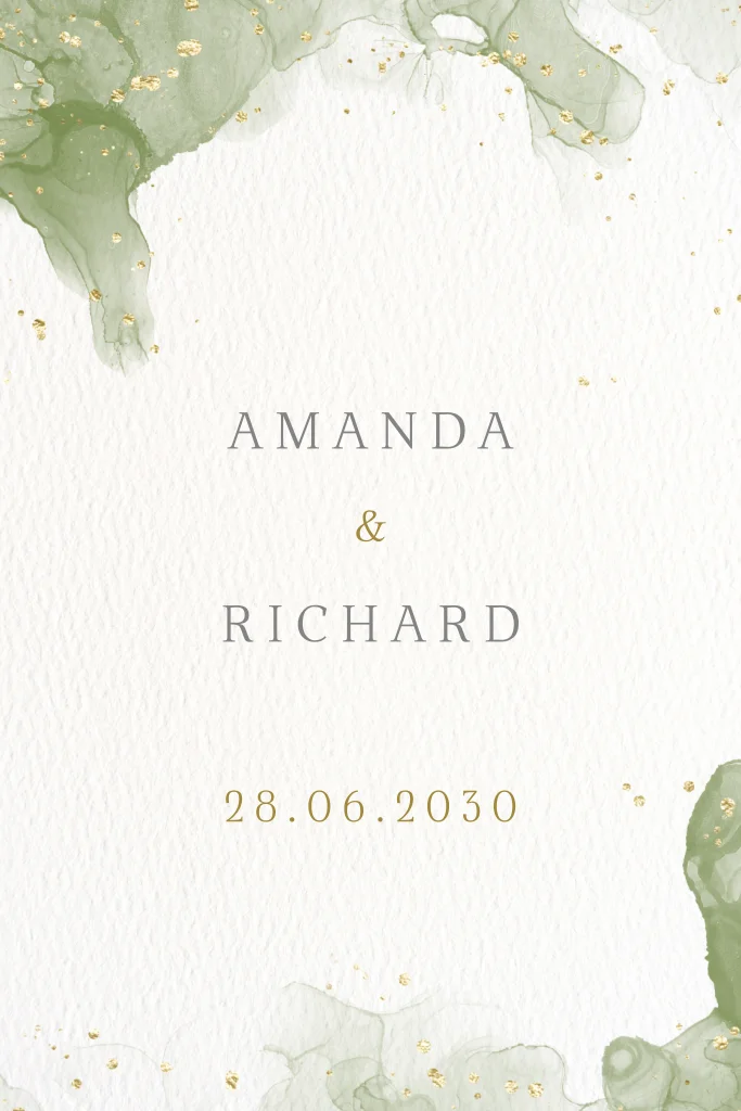 Botanische Save the Date kaart met groene waterverf en subtiele gouden details. De combinatie van zachte tinten en strak lettertype zorgt voor een moderne, rustige uitstraling. Ideaal voor een stijlvolle bruiloft met natuurlijke accenten. Pas tekst en kleuren eenvoudig aan in de editor en maak de kaart persoonlijk.