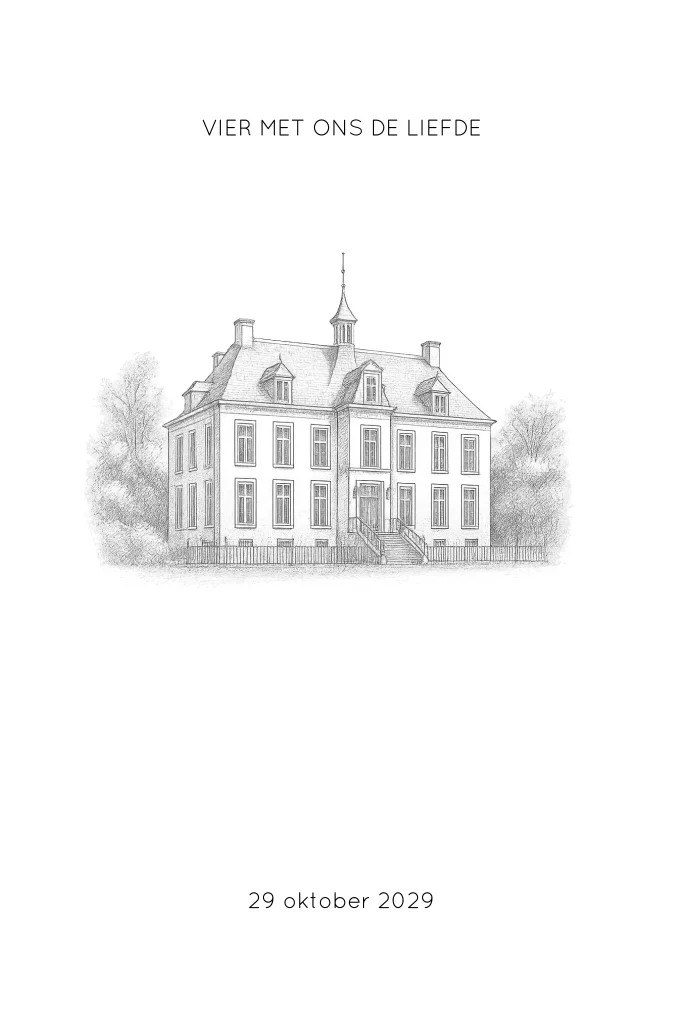 Een elegant Save the Date kaartje met een handgetekende illustratie van een landhuis. De combinatie van fijne lijnen en gouden typografie geeft het ontwerp een klassieke en stijlvolle uitstraling. Pas eenvoudig de namen, datum en tekst aan in de editor.