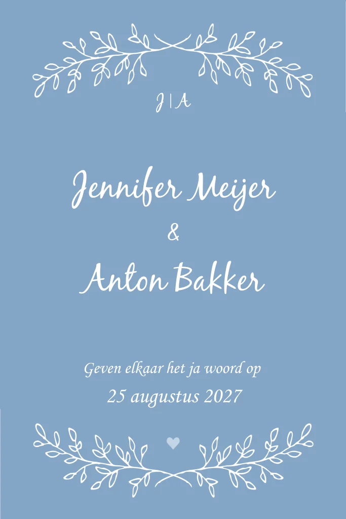 Stijlvolle blauwe uitnodiging kaart met witte bloemenkrans en sierlijk lettertype.