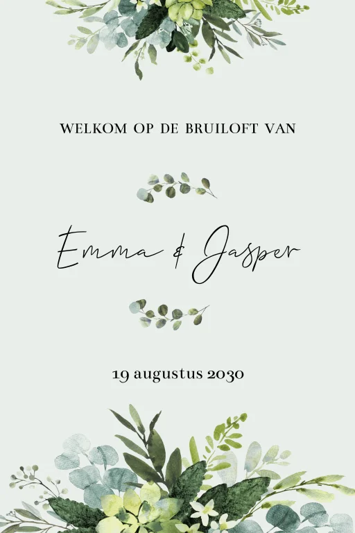 Stijlvol welkomstbord met eucalyptus en groenblad in aquarelstijl. De natuurlijke tinten en minimalistische typografie zorgen voor een rustige, moderne uitstraling. Perfect voor een bruiloft met een botanisch thema. Voeg eenvoudig jullie namen en datum toe en maak het ontwerp persoonlijk.
