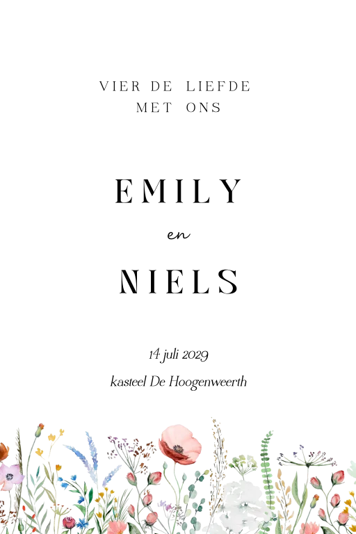 Romantisch welkomstbord met veldbloemen voor jullie bruiloft. De kleurrijke bloemen aan de onderzijde geven het ontwerp een speelse en zomerse uitstraling. Ideaal voor een buitenbruiloft of ceremonie in de natuur. Voeg eenvoudig jullie namen, datum en locatie toe in de editor en maak het bord persoonlijk.